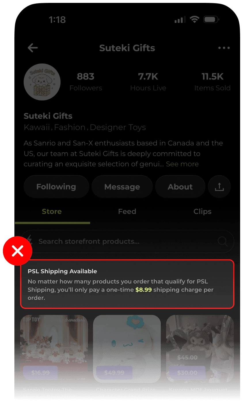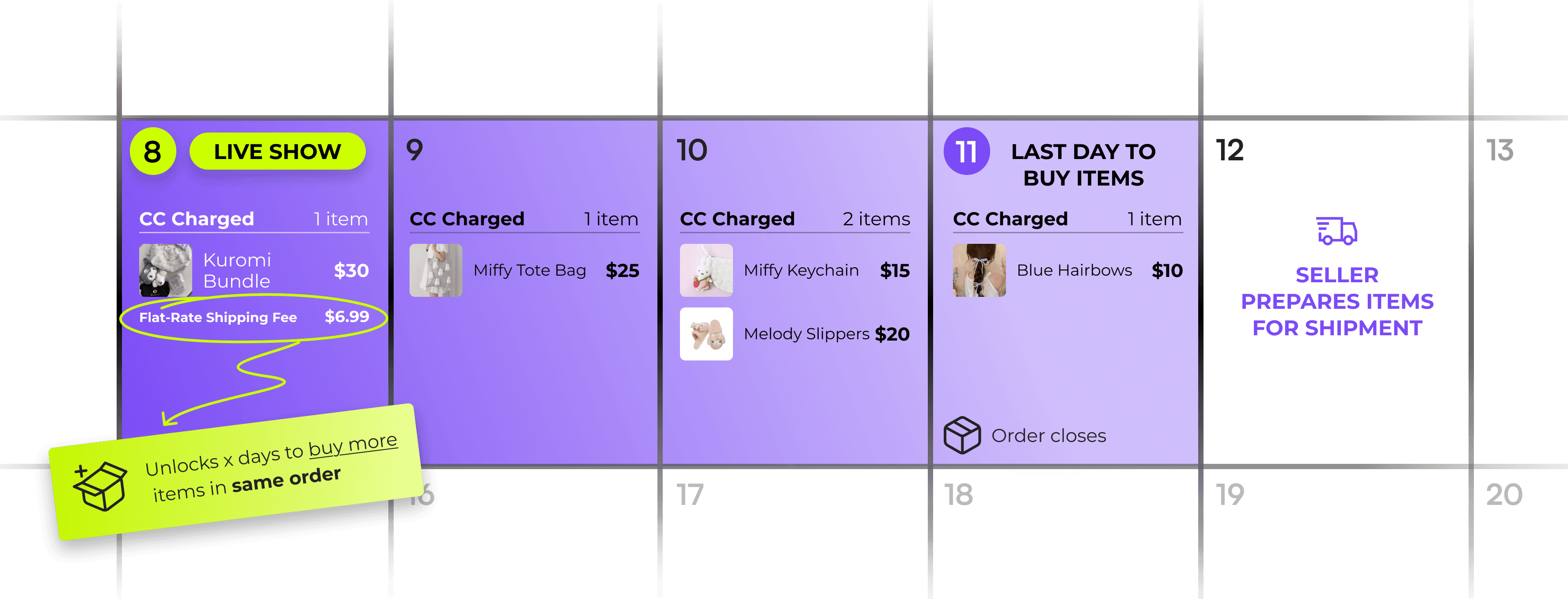 Popshop Live has a flat-rate shipping fee that allows users to pay shipping on their first purchase and unlock free shipping for additional purchases for the rest of the seller's show or for a set number of days afterward (determined by the seller).